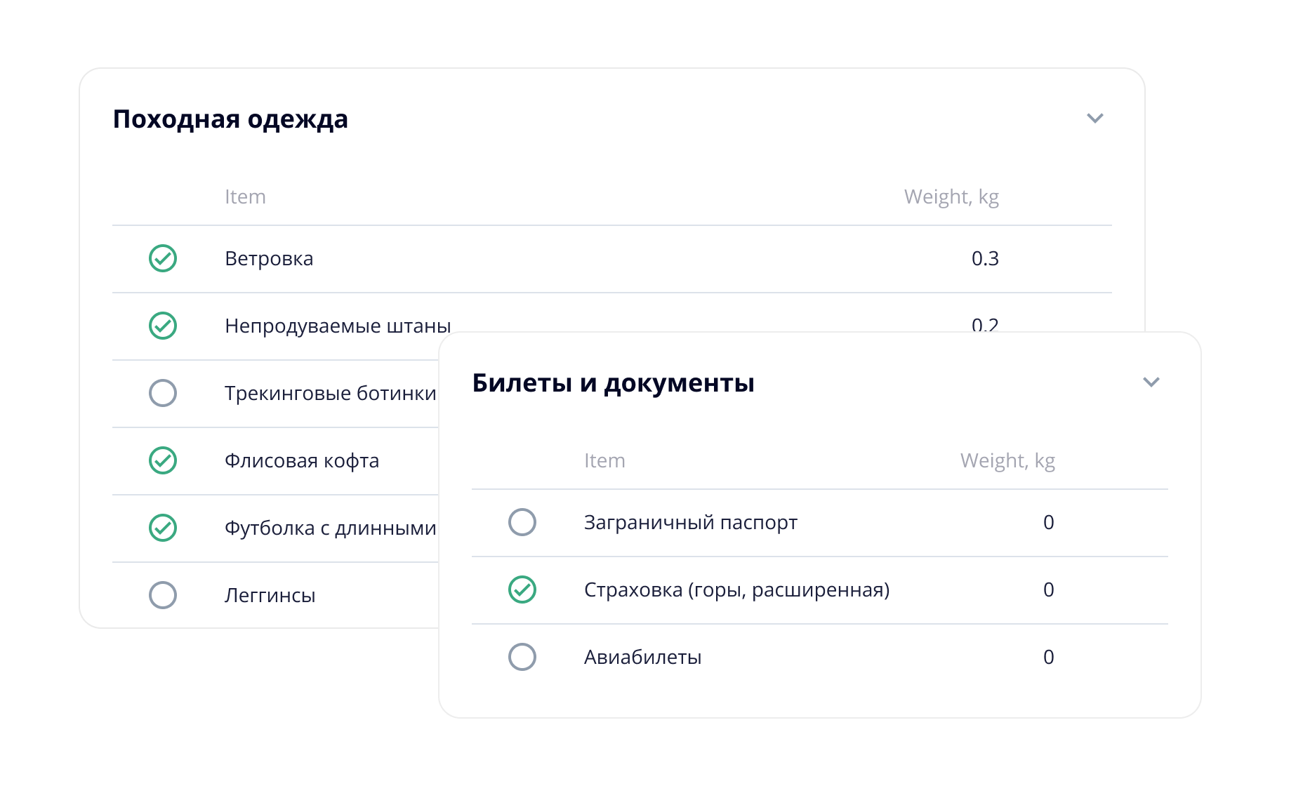 Сделайте свои путешествия более комфортными и получите невероятные впечатления: убедитесь, что вы ничего не забыли, заполняя чек-листы личного, общего снаряжения и документов. Создавайте тур, приглашайте участников и распространяйте чек-листы между ними!