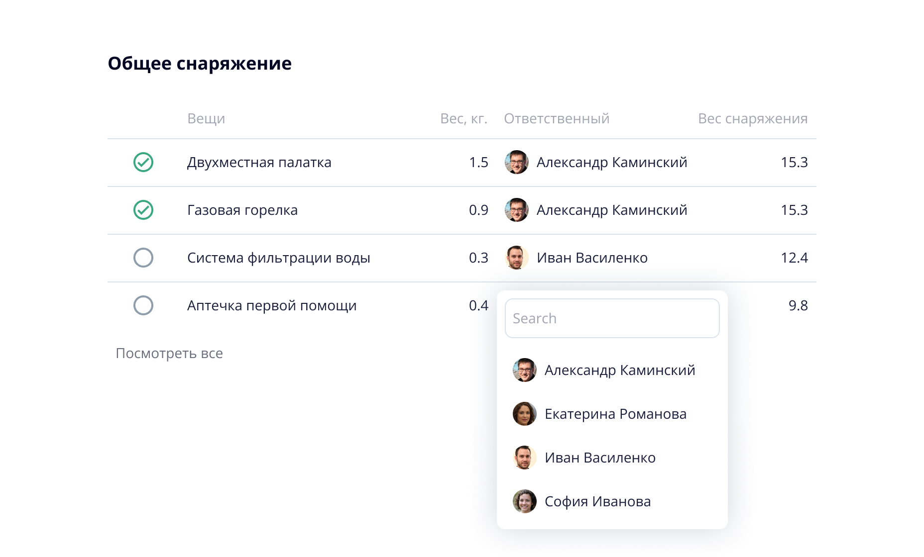 Взаимодействуйте с участниками, координируйте подготовку. Пока вы и ваша команда собираете снаряжение и отмечаете вещи в чек-листе, платформа обновляет информацию в режиме реального времени. Проверяйте чек-листы каждого участника, чтобы убедиться, что все члены группы готовы к путешествию!