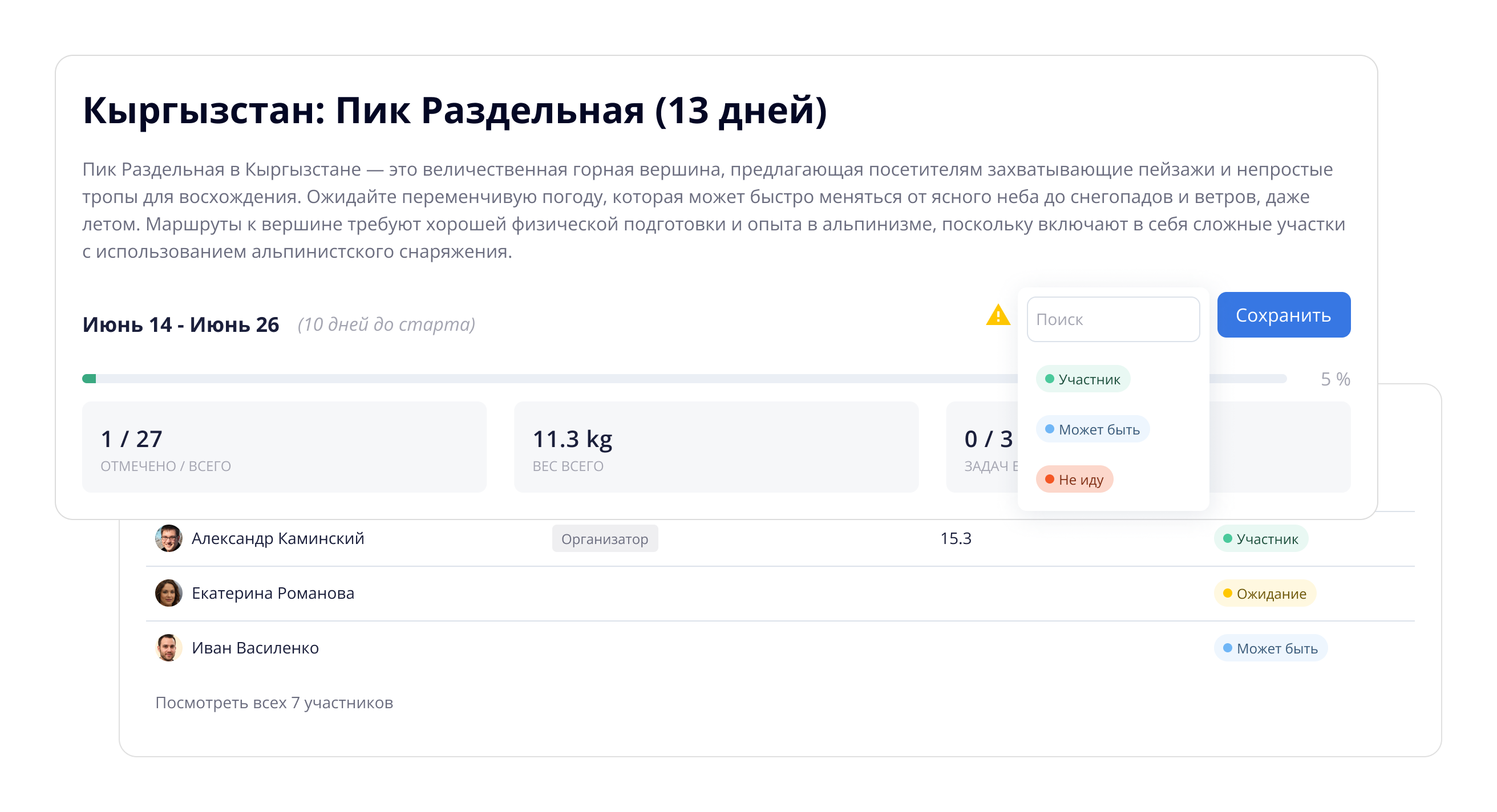 Как любители природы и горных походов мы часто сталкивались с проблемой планирования во время организации походов в горы. Многочисленные трекеры и таблицы, которые мы заполняли, никогда не давали нам уверенности в том, что все участники тура подготовлены должным образом. А количество задаваемых вопросов заставляло нас тратить бесконечные минуты времени на звонки и переписки в чатах.